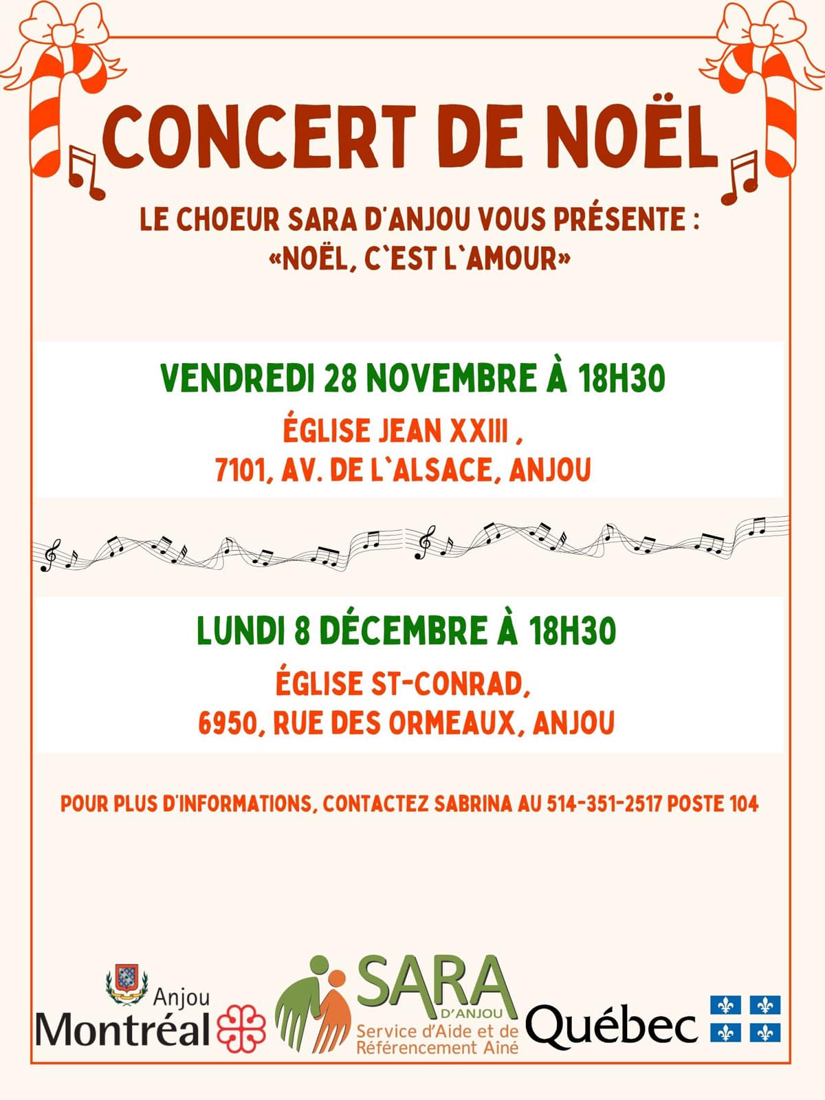 Information et inscription : contactez Sabrina au 514 351-2517 poste 104 ou au s.tousignant@sara-anjou.com