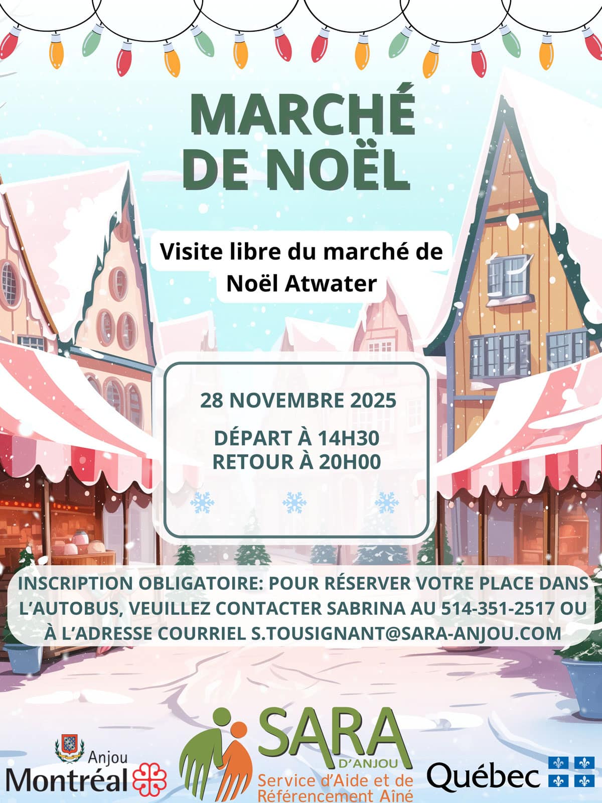 Pour réserver votre place dans l’autobus, veuillez contacter Sabrina au 514 351-2517 ou à l’adresse courriel s.tousignant@sara-anjou.com