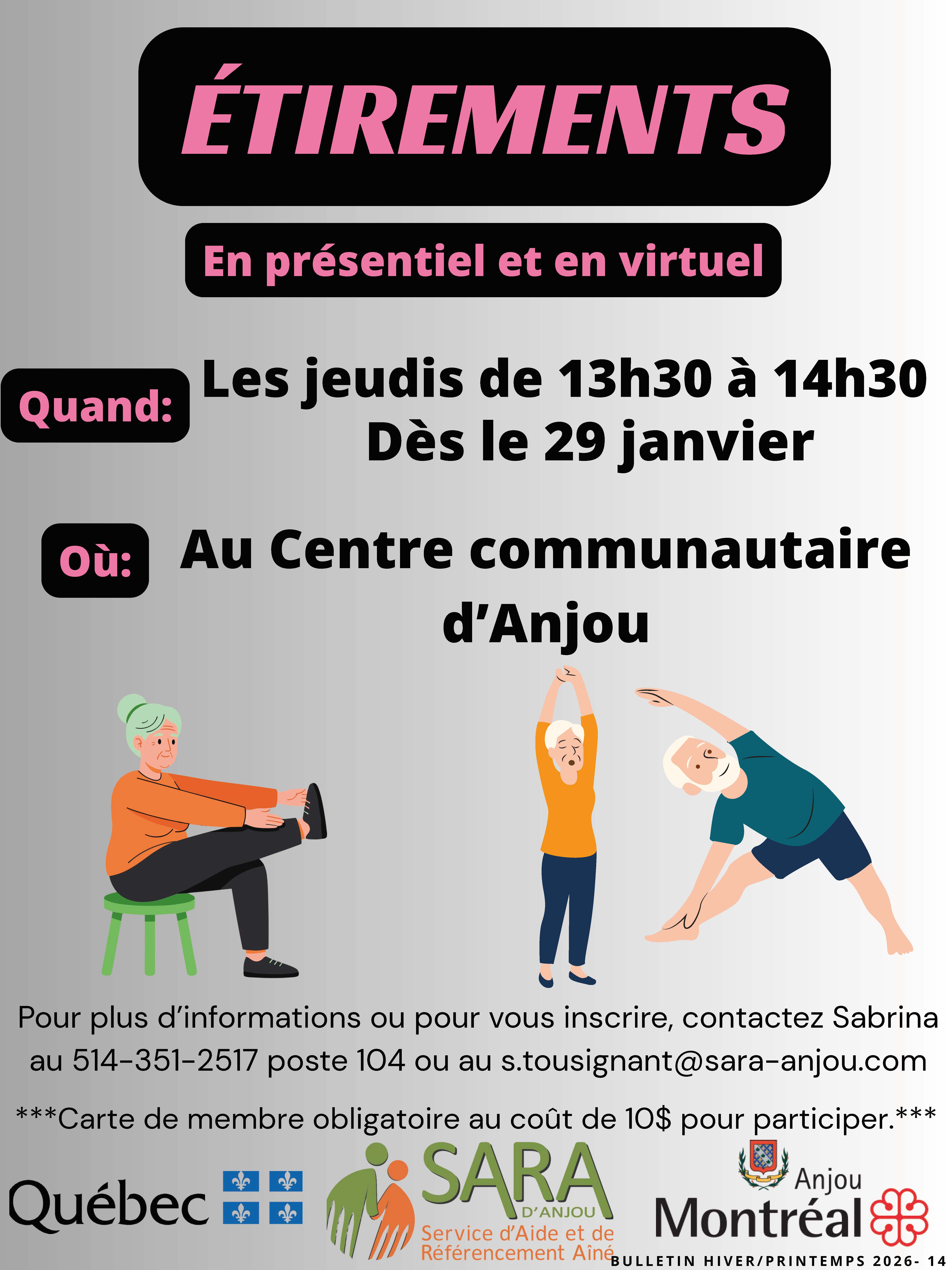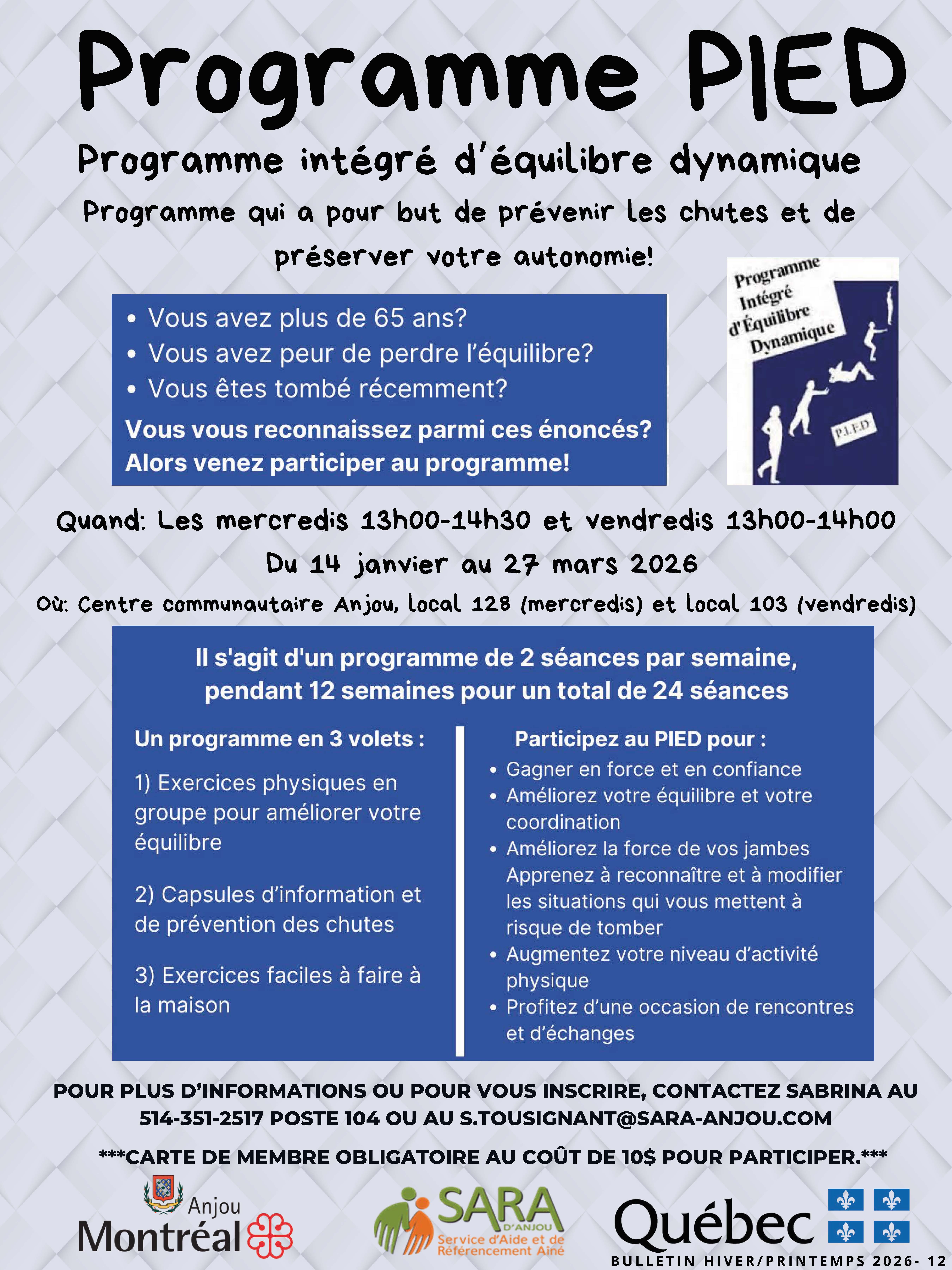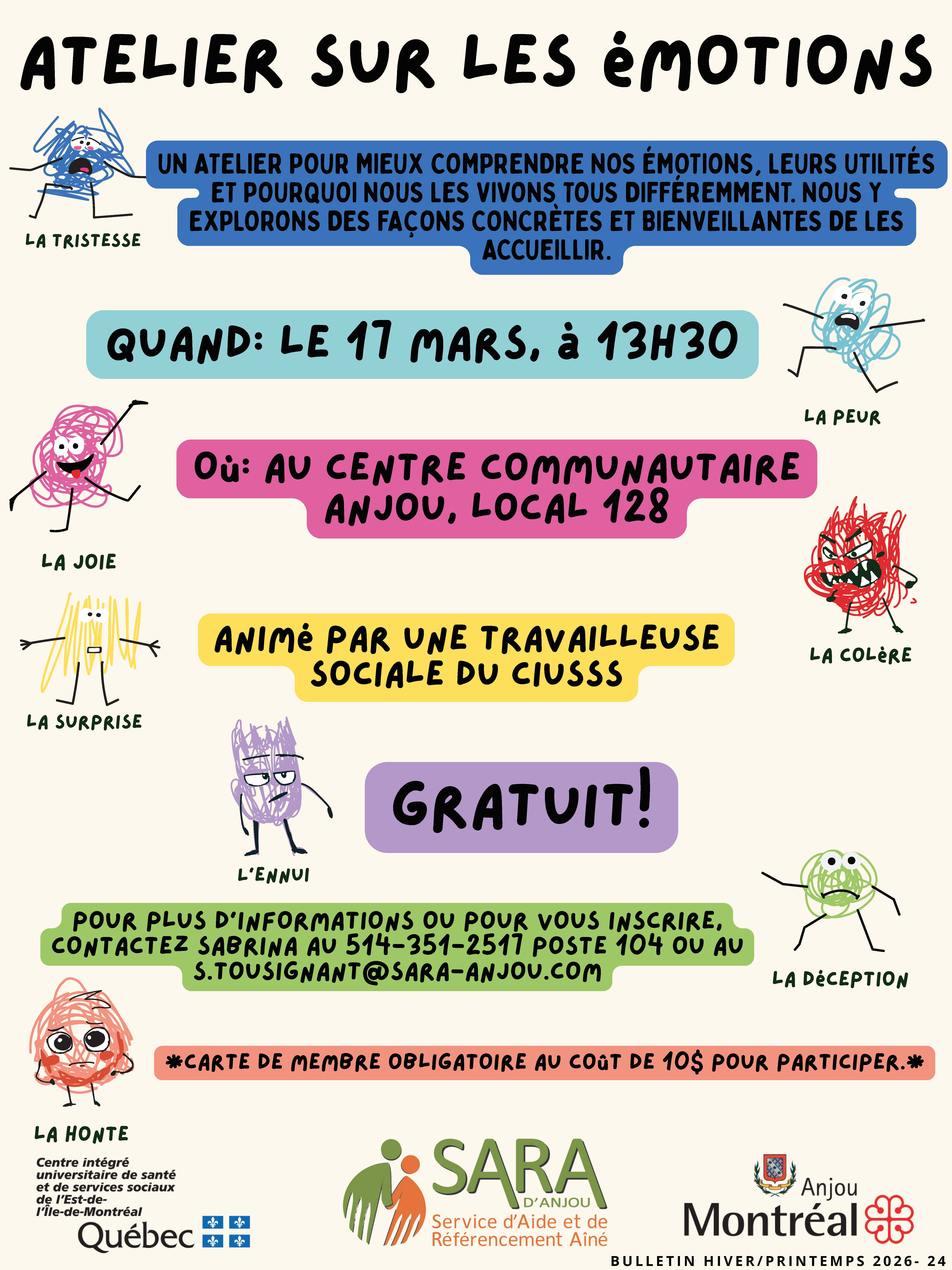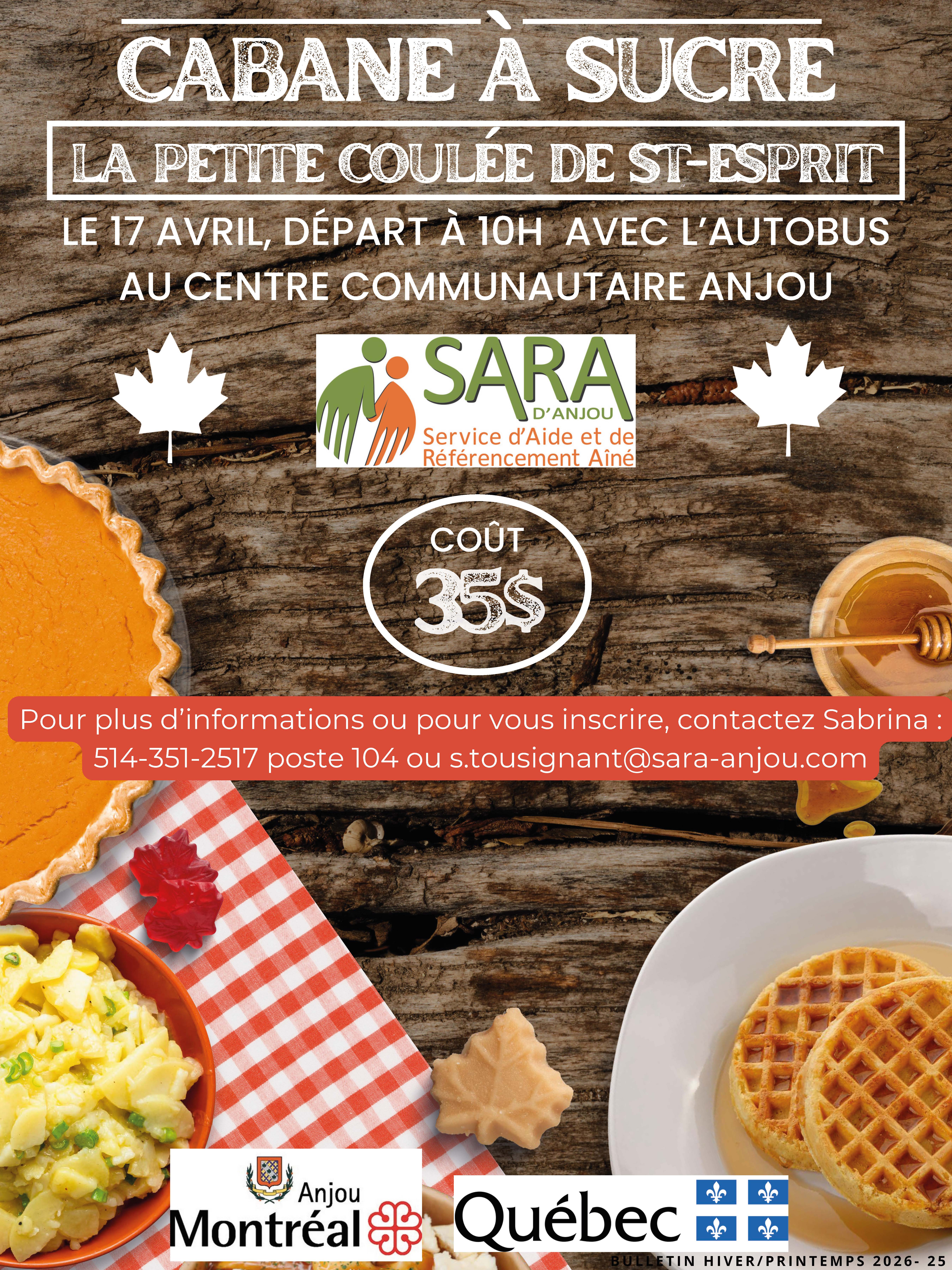 Information et inscription : 514 351-2517 poste 104 ou s.tousignant@sara-anjou.com