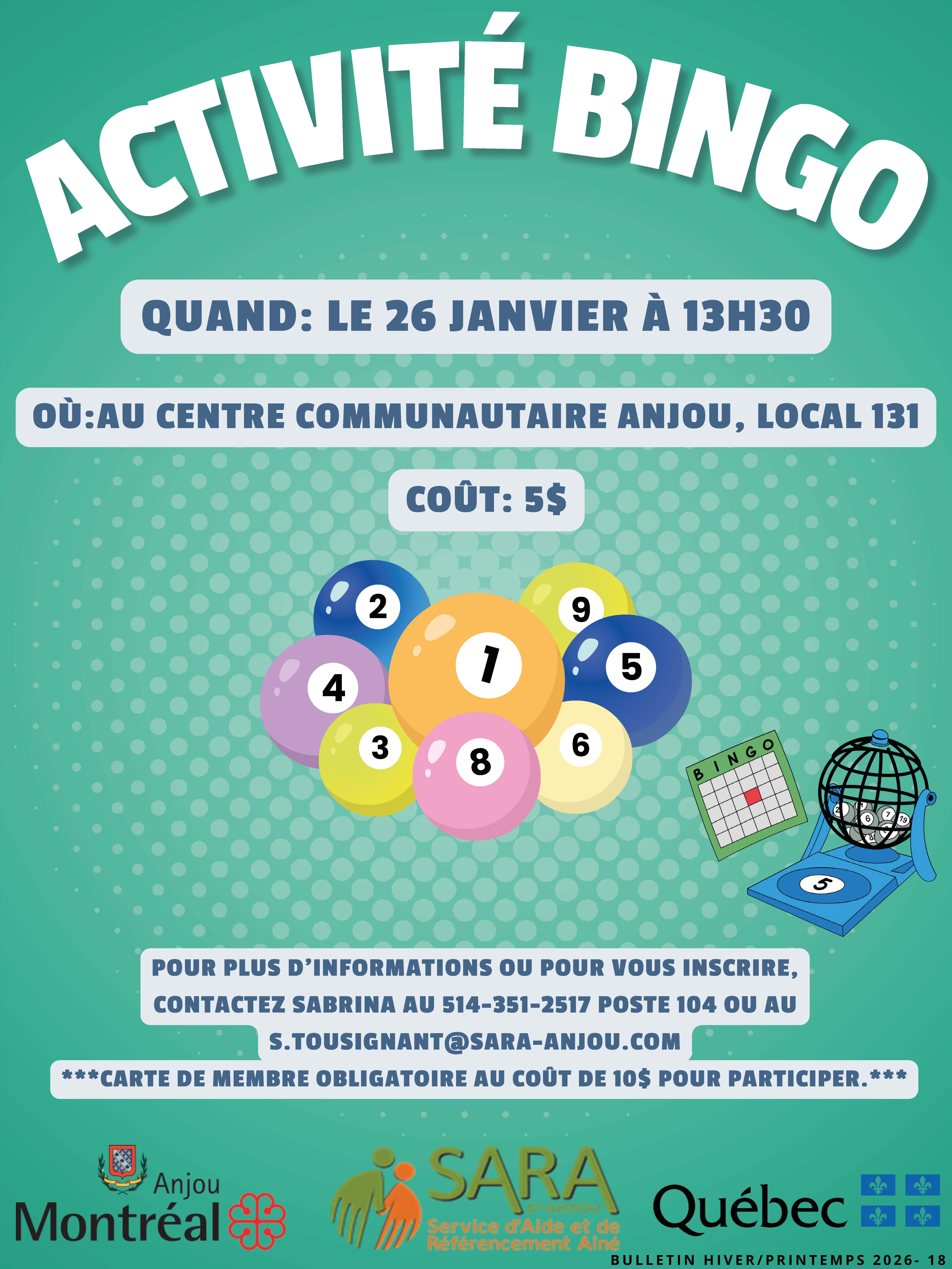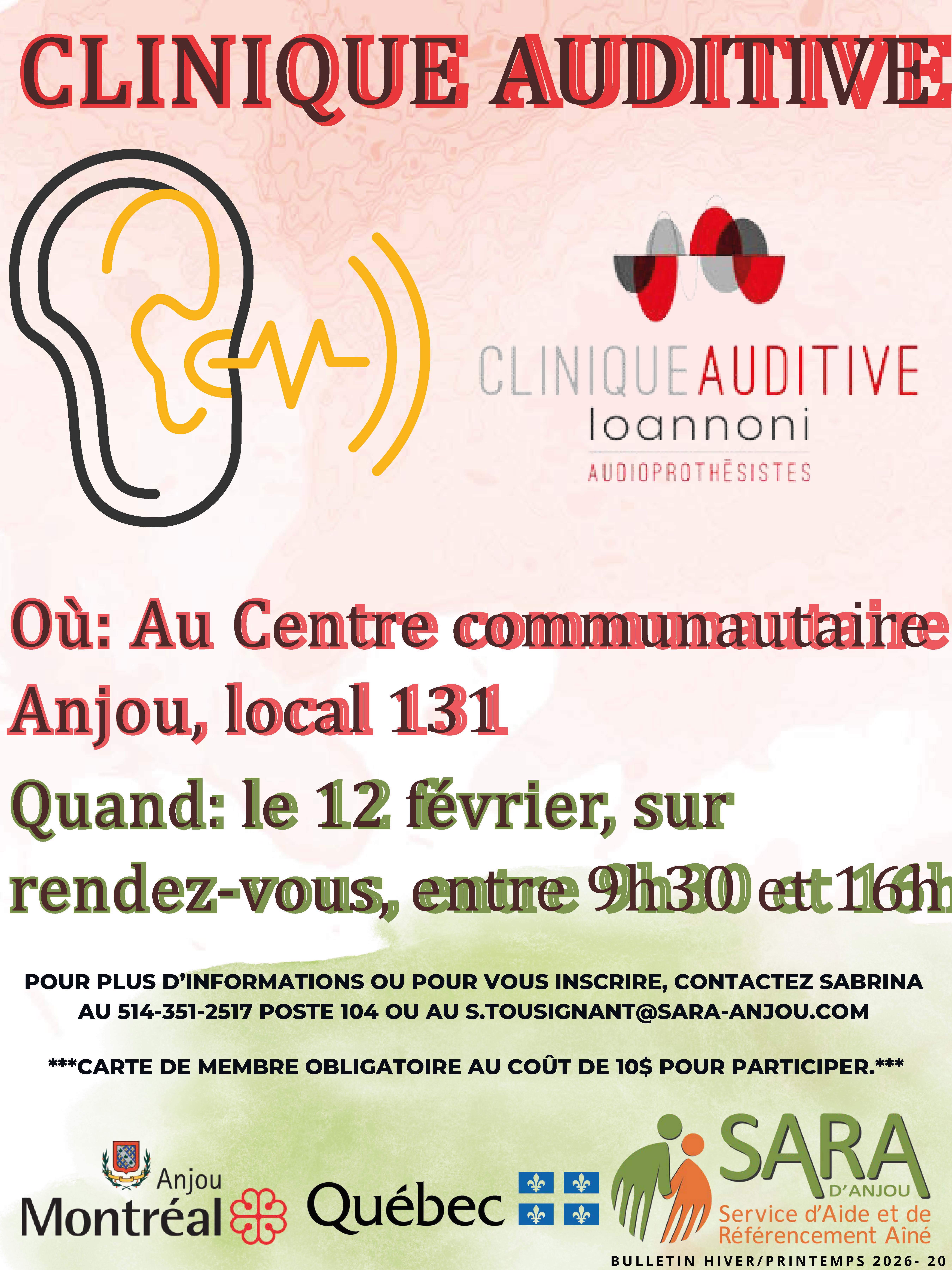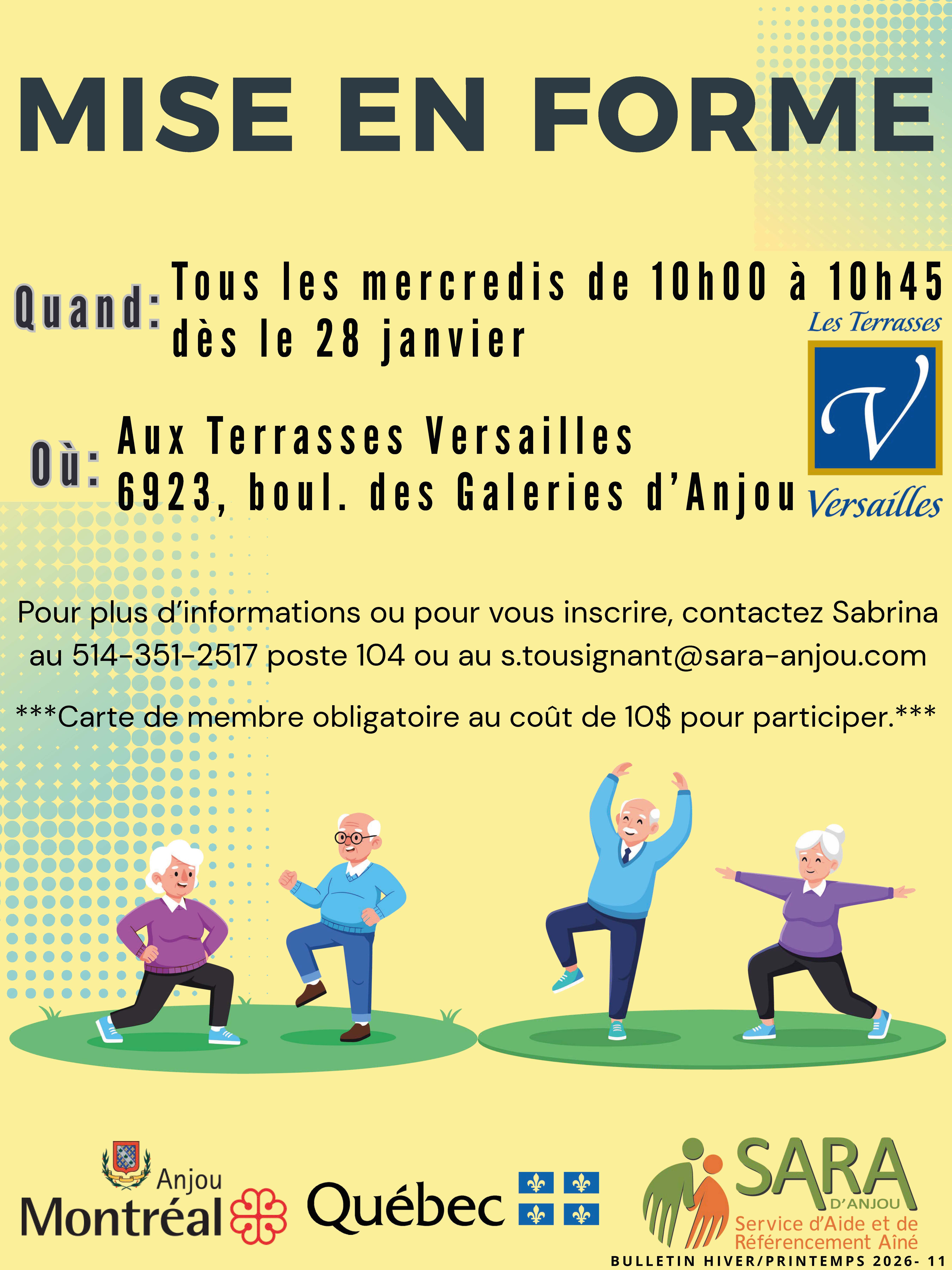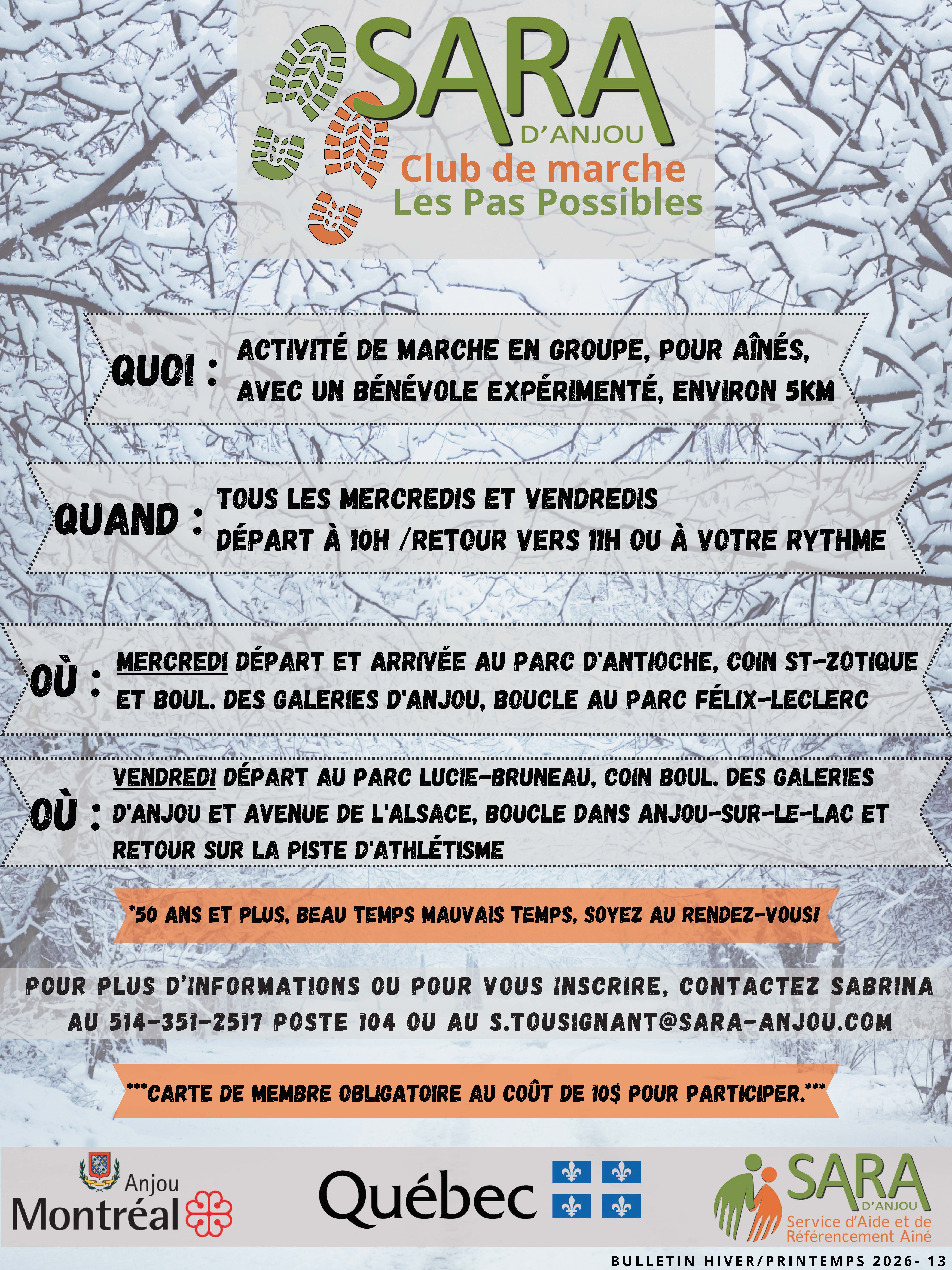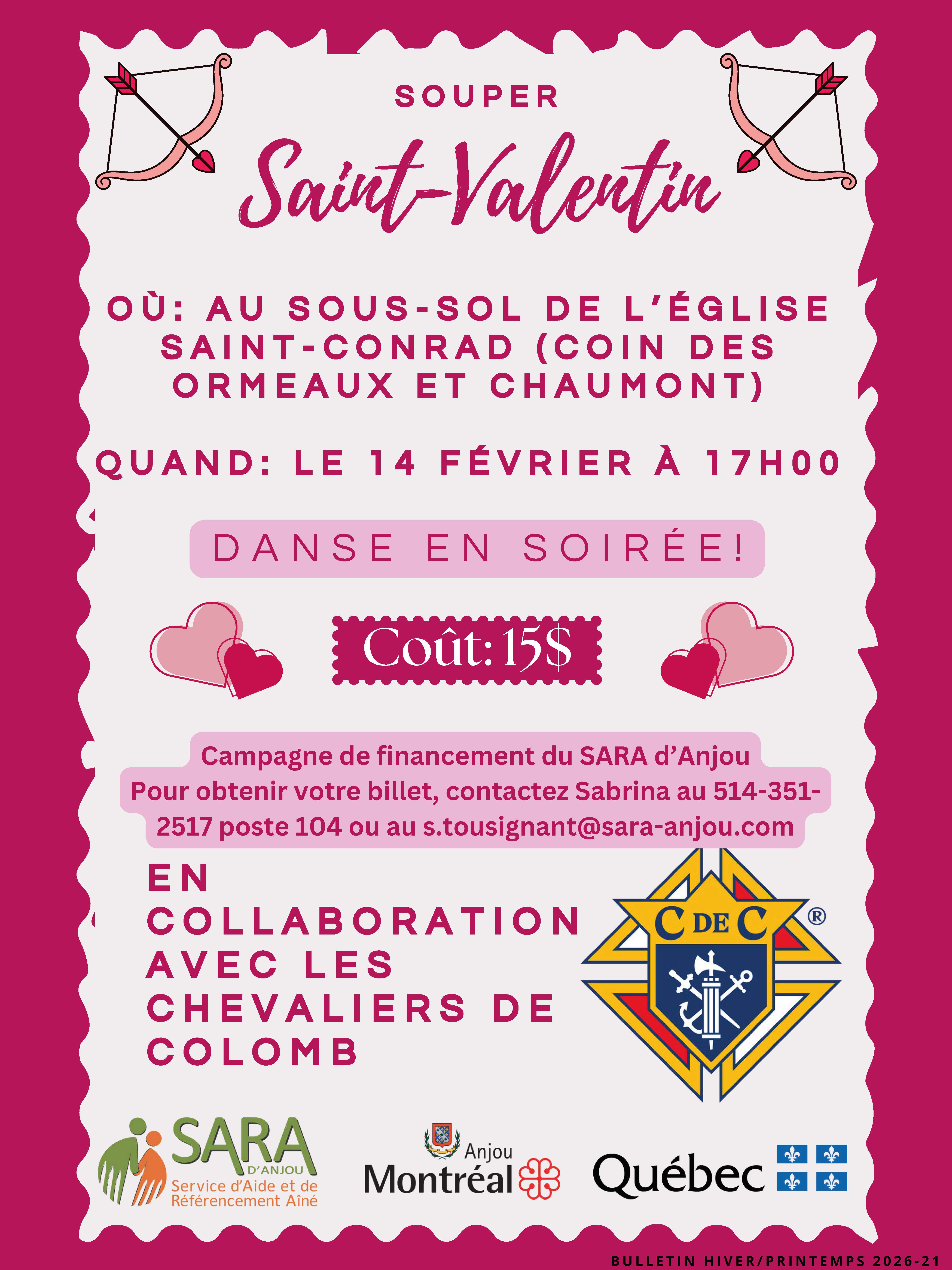 Information et inscription : 514 351-2517 poste 104 ou s.tousignant@sara-anjou.com